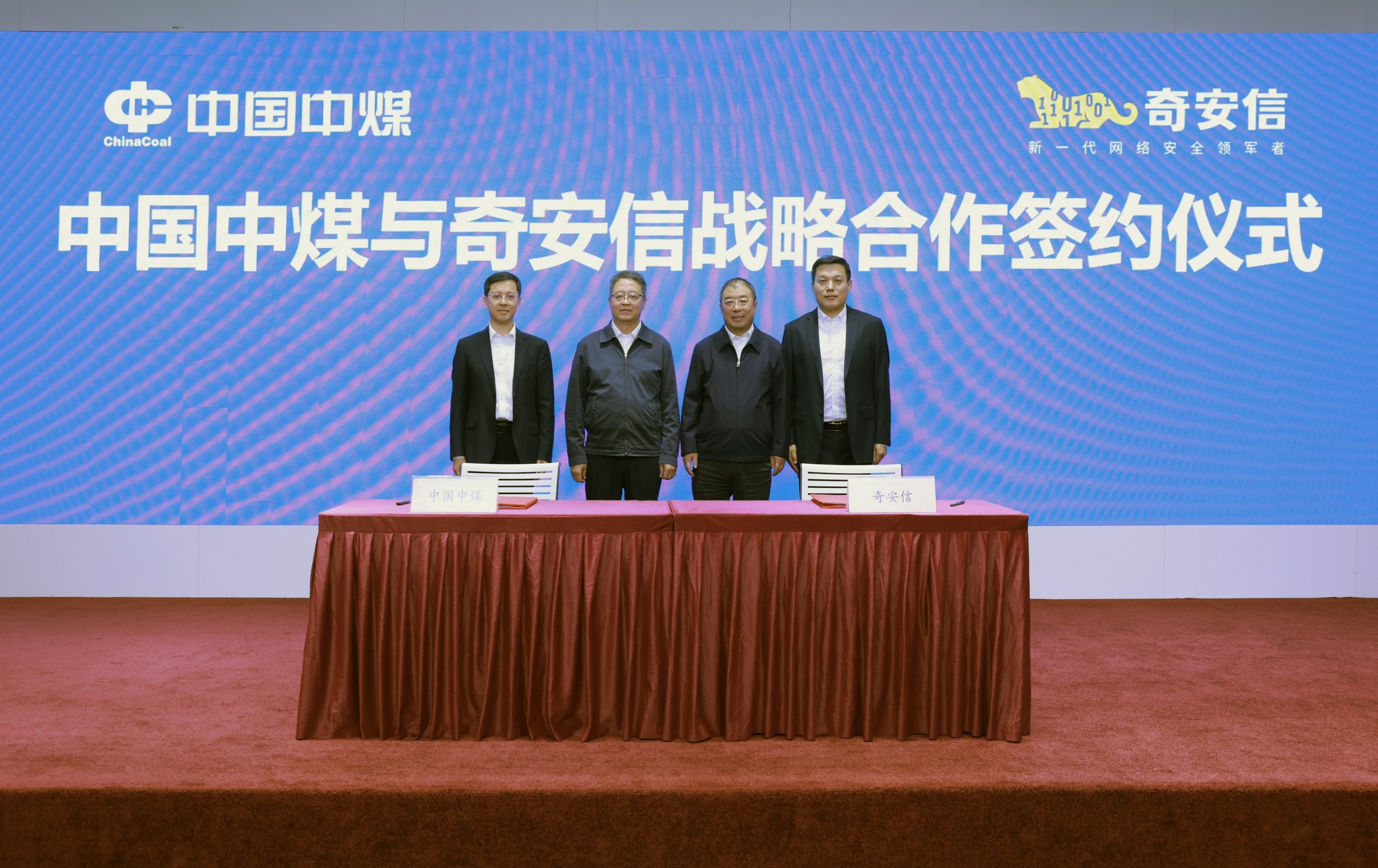 10月9日,中國中煤與奇安信集團在京簽署戰(zhàn)略合作協(xié)議。中國中煤黨委書記、董事長王樹東與奇安信集團黨委書記、董事長齊向東舉行工作會談并見證簽約。中國中煤黨委常委、副總經(jīng)理倪嘉宇,奇安信集團高級副總裁吳登峰分別代表雙方簽署協(xié)議。奇安信集團副總裁唐皓參加活動。
